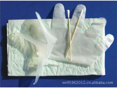 【结构及组成】: 本品基本配置为一次性使用无菌阴道扩张器、一次性使用薄膜检查手套和选用配置医用棉签、一次性使用医用橡胶检查手套、医用纱布块、一次性医用垫、一次性医用包布、刮板、塑料盘等组成。